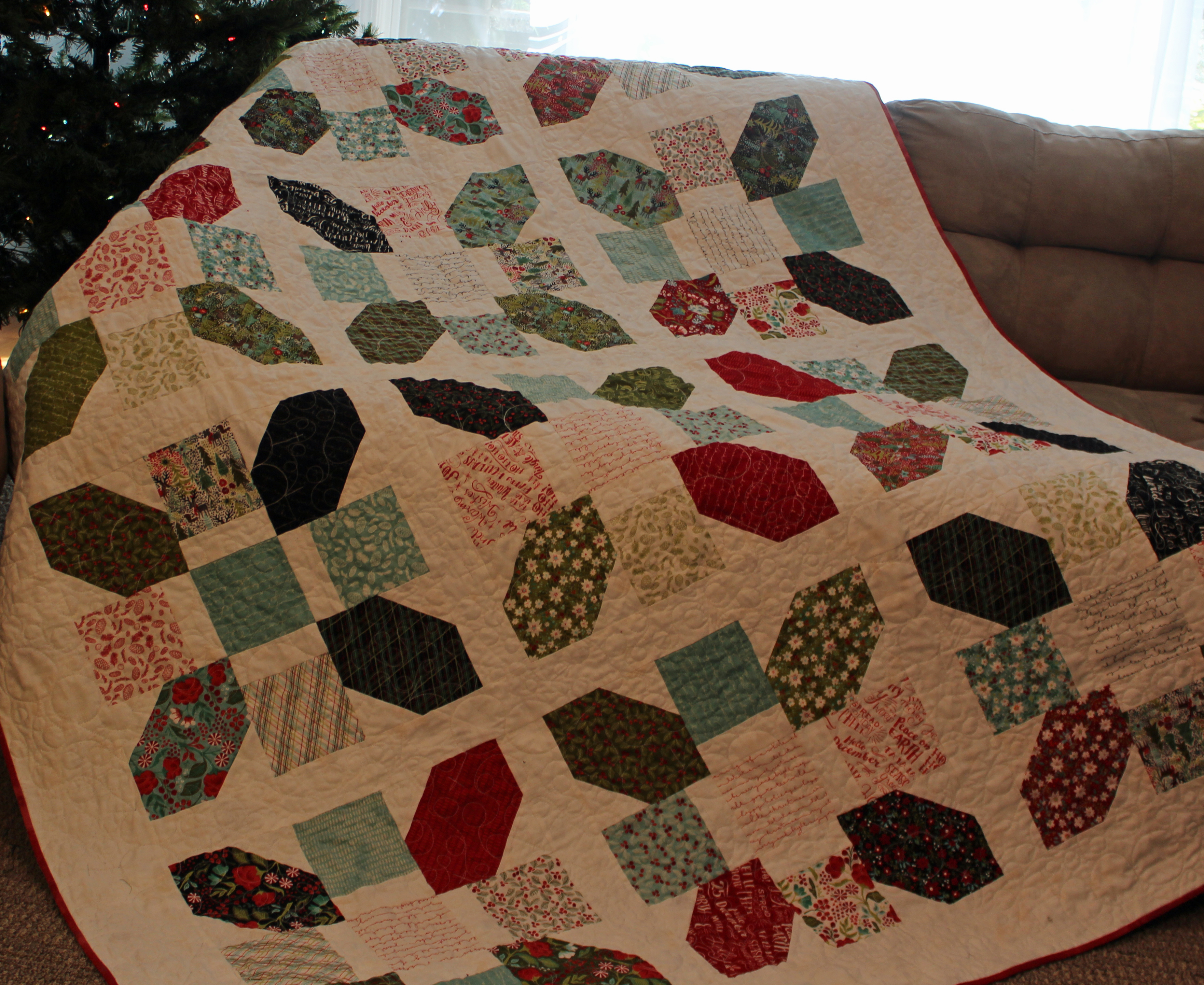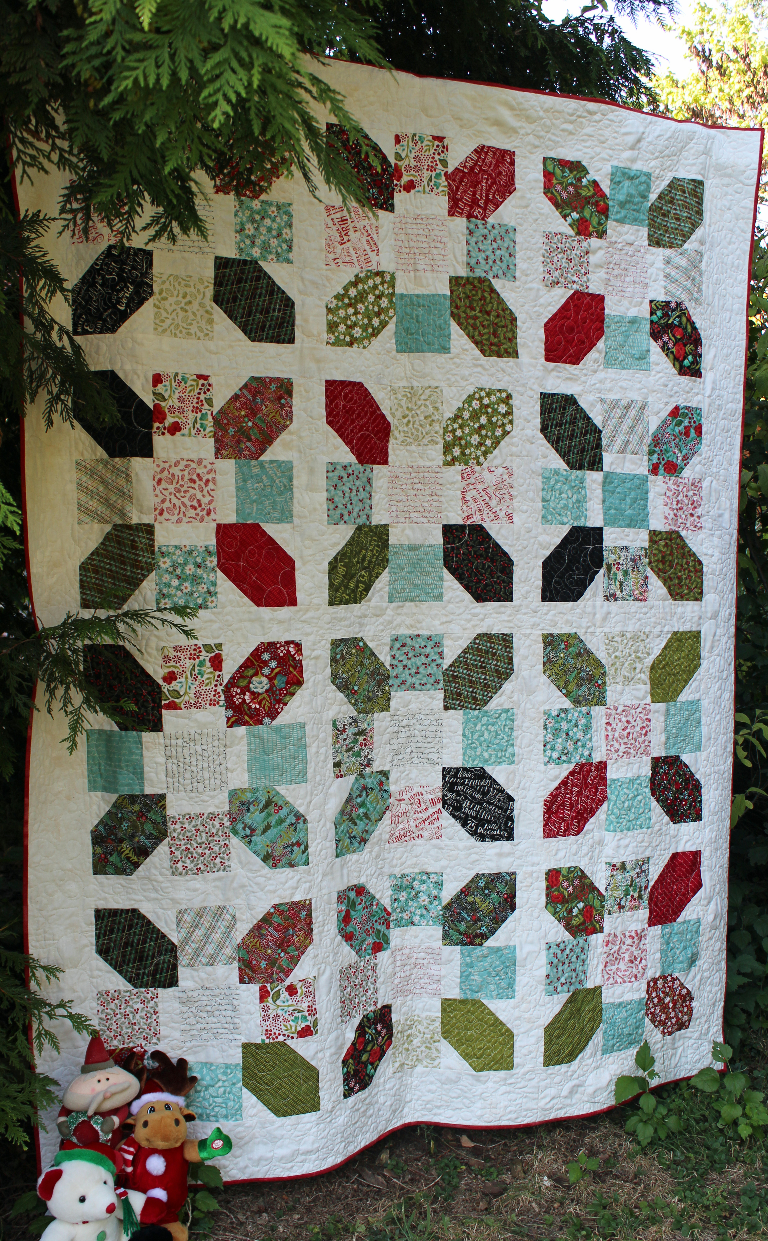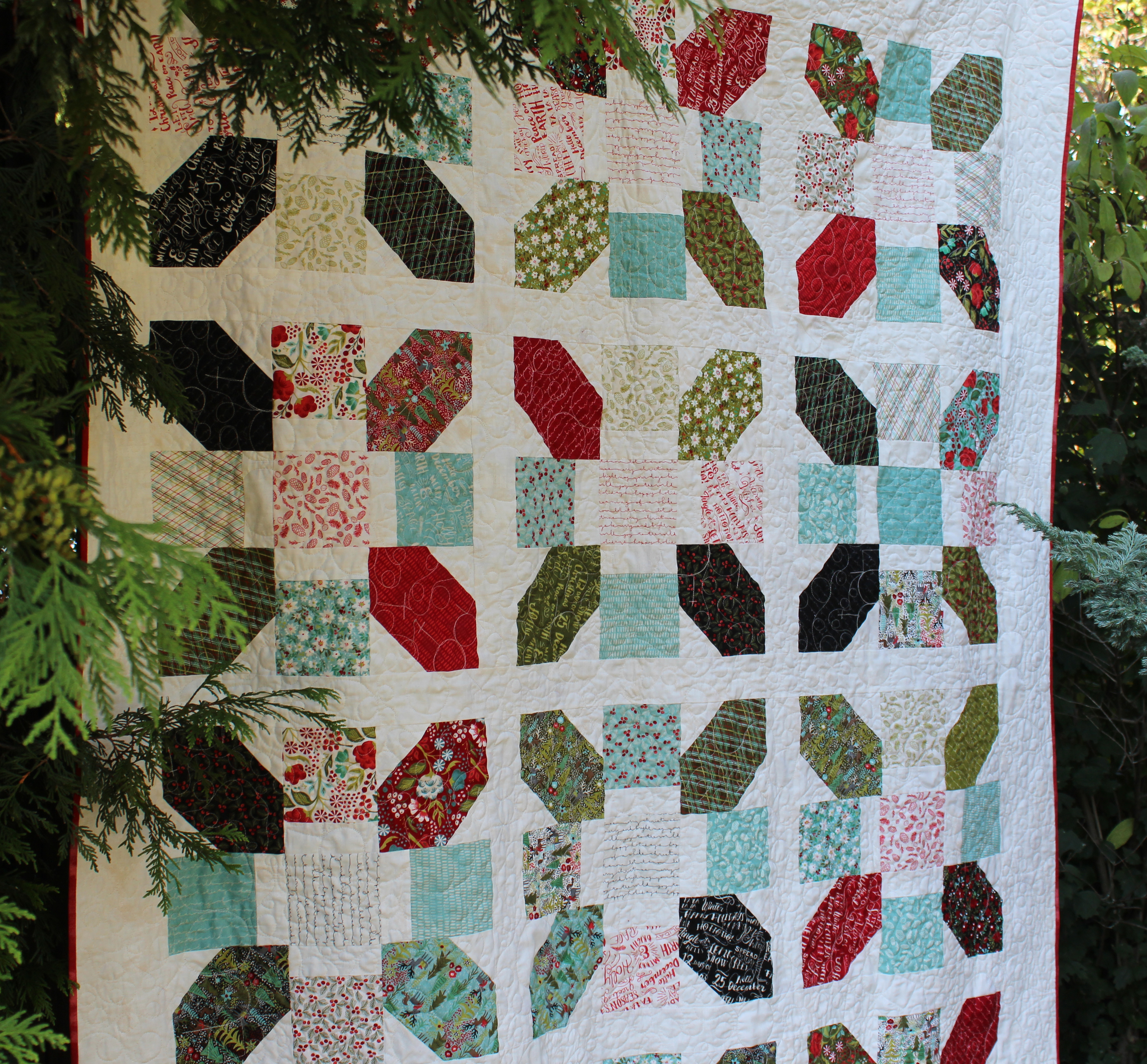 I decided I wanted to make a seasonal quilt. Believe it or not, I have no seasonal quilts in my home. I’ve never made one!! So I chose the Juniper Berry by Basic Grey for Moda fabrics. I love the traditional and not so traditional colors all mixed in. For the sashing I used Vanilla Grunge and the binding is Cherry Grunge. I’ve been admiring the Grunge line for a while now and was thrilled to get to use it. And let me tell you the Cherry Grunge can only be described as luscious.