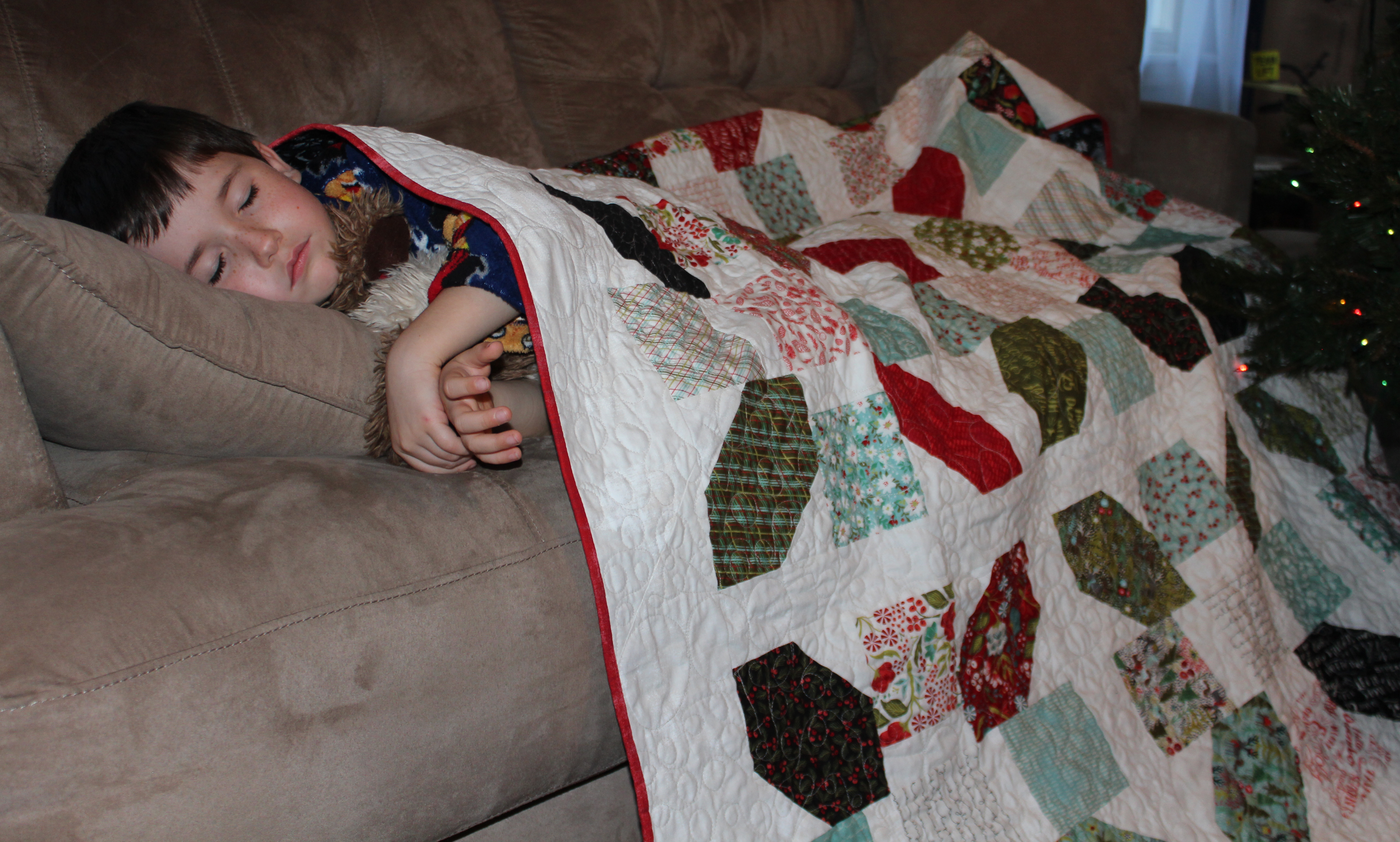 Now for some glamour shots of the finished quilt. Lucas was thrilled to be a model for me.